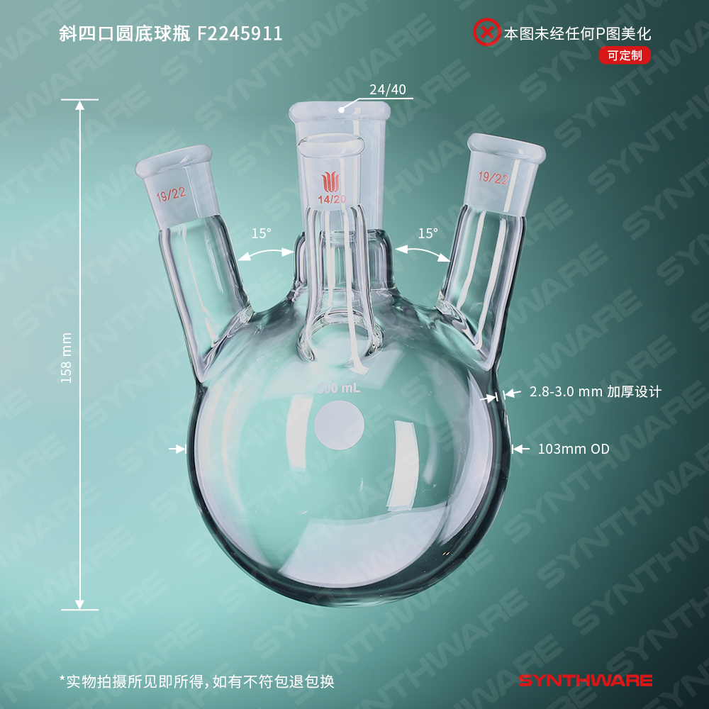 斜四口圆底球瓶,中口:29/42,侧口:24/40,前口:14/20,500ml F2225041