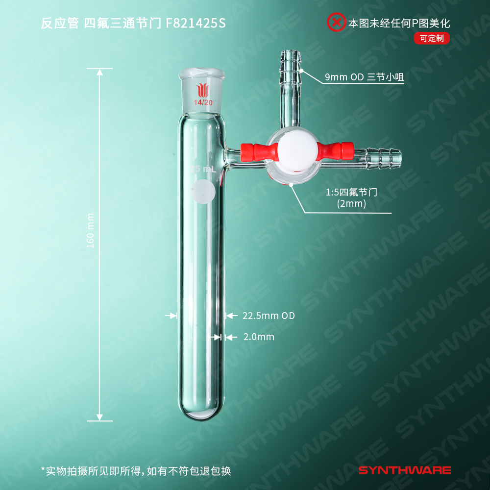 反应管,四氟三通节门,磨口:14/20,容量:25ml F821425S
