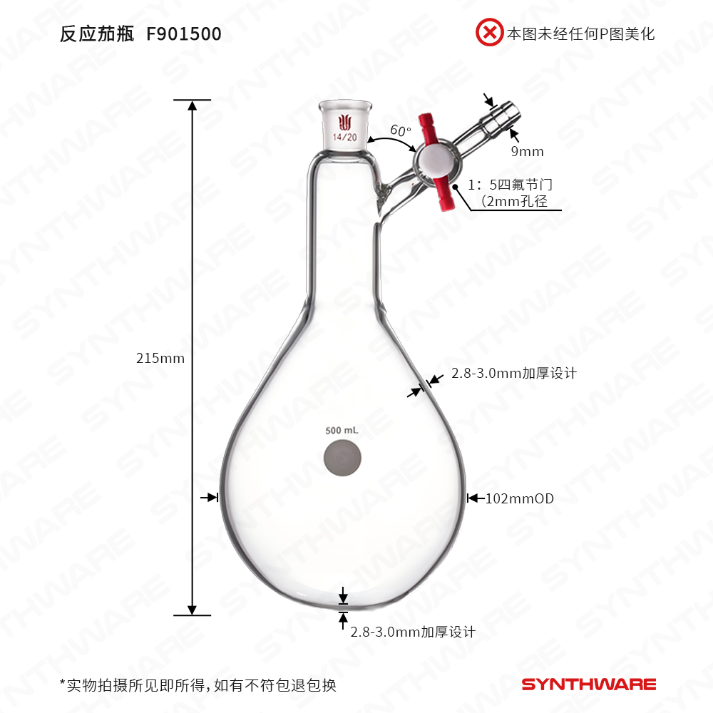 反应茄瓶,磨口:14/20,500ml,四氟节门 F901500