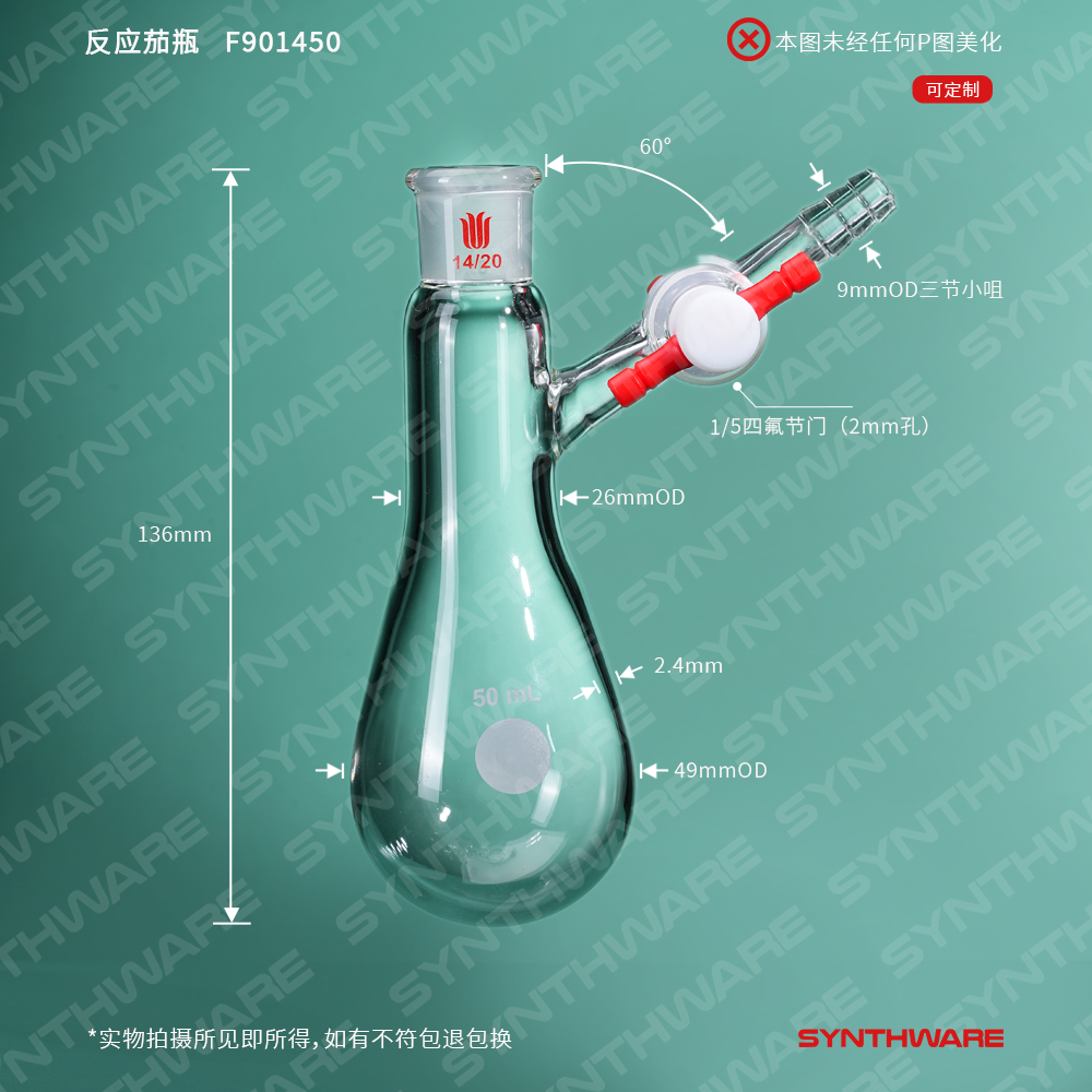 反应茄瓶,磨口:14/20,50ml,四氟节门 F901450
