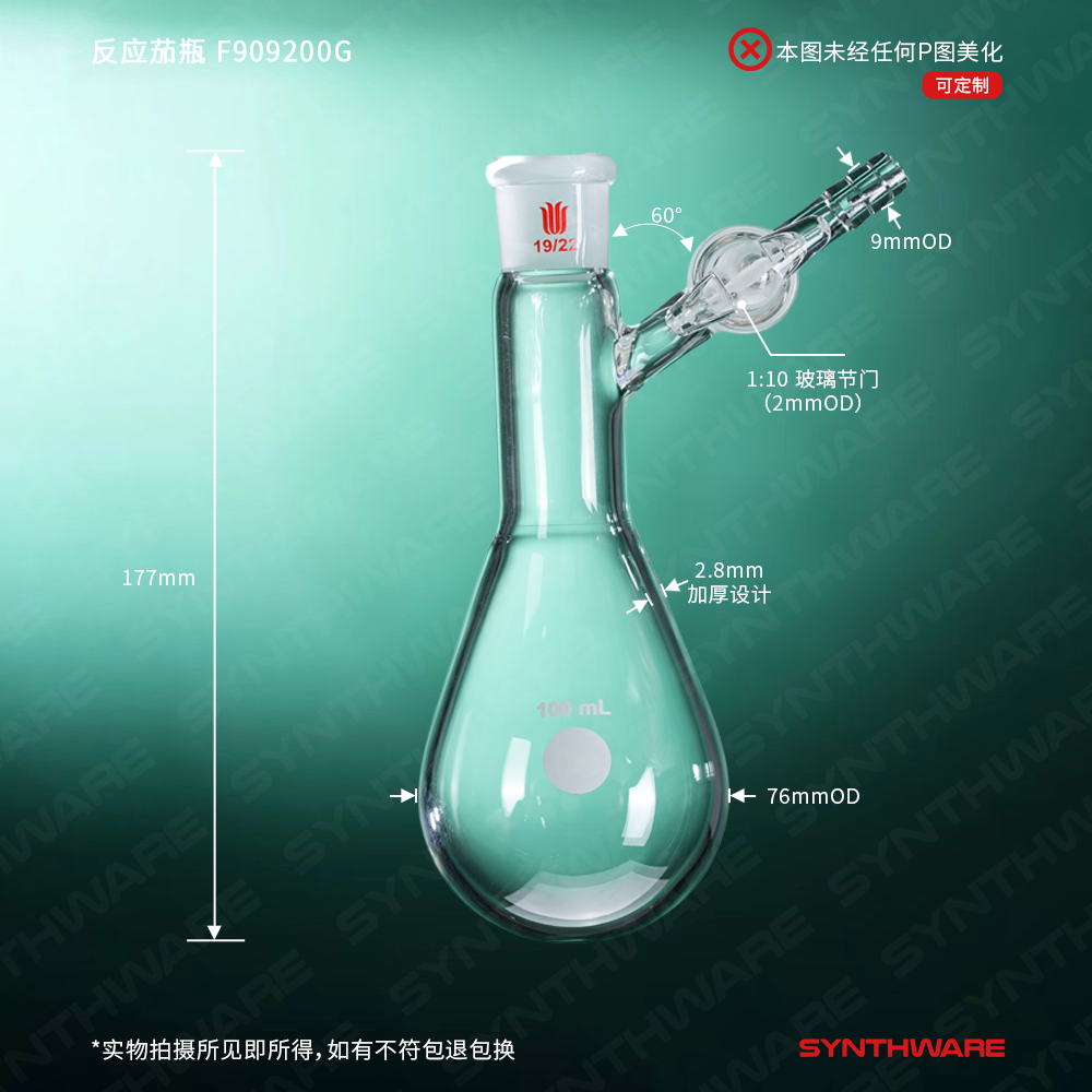 反应茄瓶,磨口:19/22,200ml,玻璃节门 F909200G