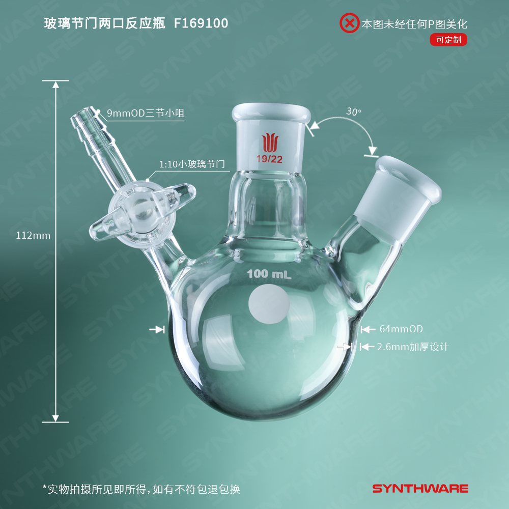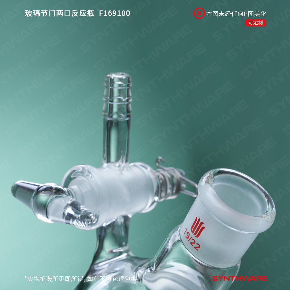 # 此款反应瓶具有两个标准磨口和一个玻璃节门。内磨口由400目金刚砂研磨,保证密封性。