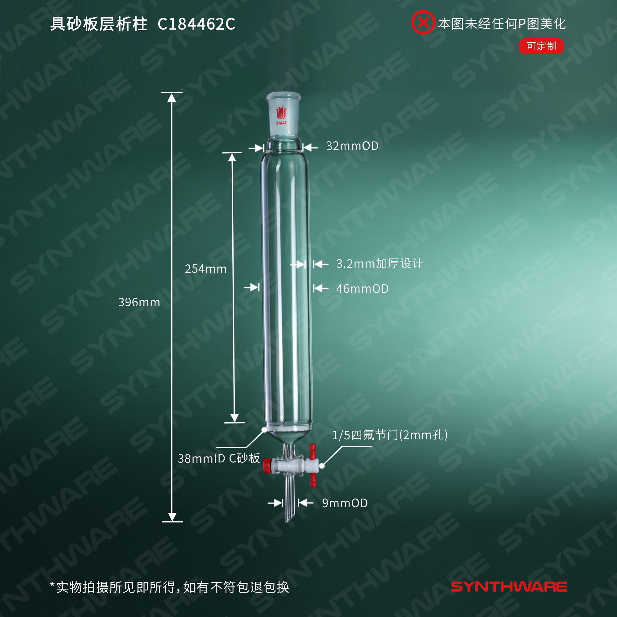 层析类 > 层析柱 > 具砂板闪式层析柱 > SYNTHWARE > 具砂板层析柱,φ46mm,有效长254mm,节门孔径:2mm,24/40 C184462C