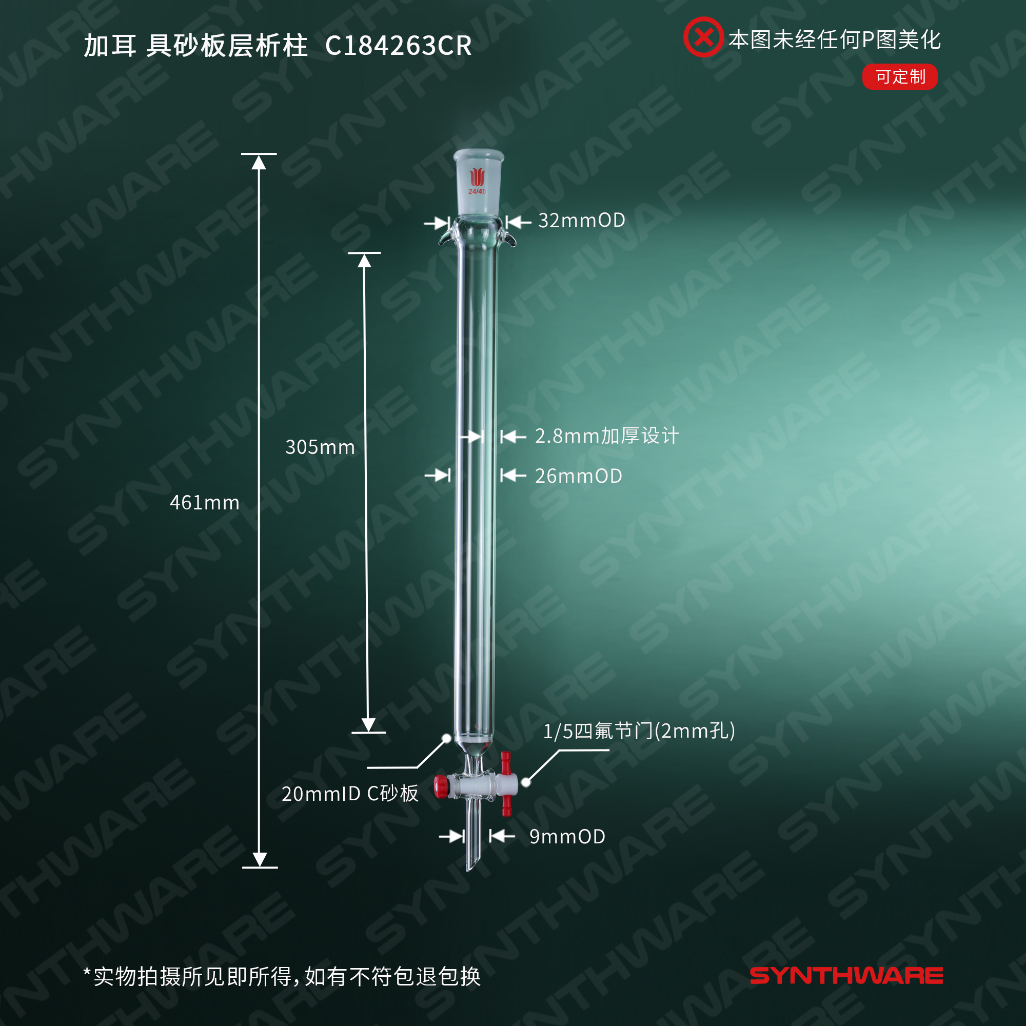 层析类 > 层析柱 > 带挂钩-具砂板闪式层析柱 > SYNTHWARE > 加耳 具砂板层析柱,φ26mm,有效长305mm,节门孔径:2mm,24/40 C184263CR