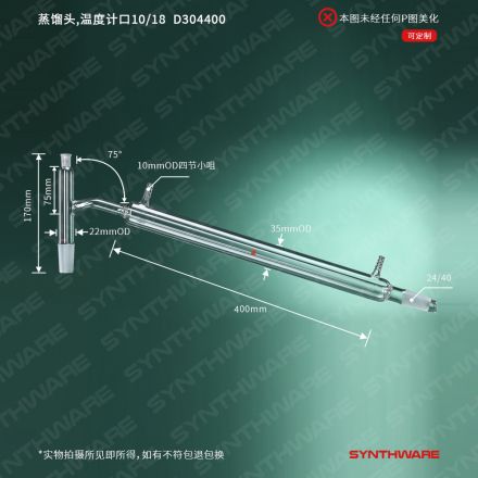 蒸馏头,可与插入深度为76mm的磨口温度计配套使用,冷凝管部分夹角为75°