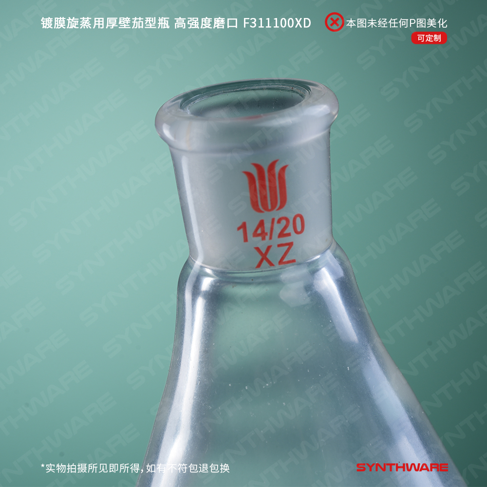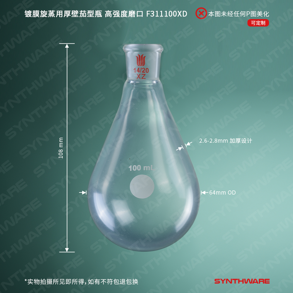 旋蒸类 > 旋蒸瓶 > 镀膜-厚壁茄瓶 > SYNTHWARE > 库存售完即止,镀膜,旋蒸用厚壁茄型瓶,高强度,磨口:14/20,100ml F311100XD