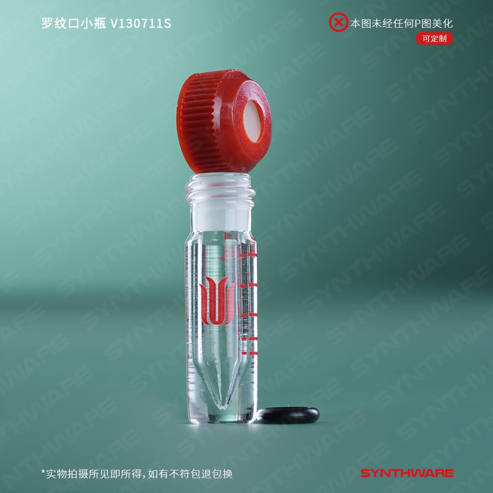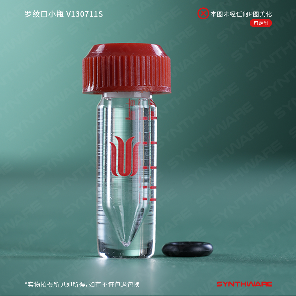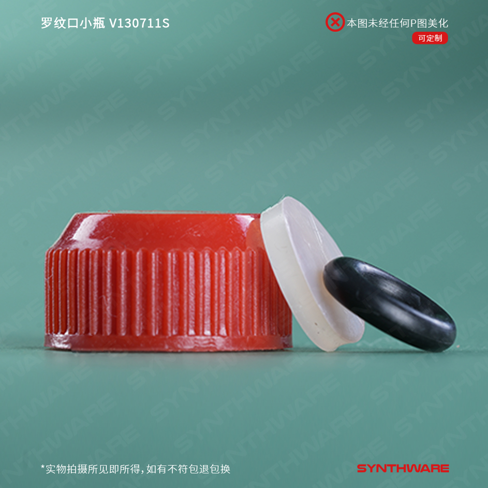 罗纹口小瓶,内具锥形底部,厚壁;标配有无孔螺纹盖,具四氟垫片 V130711S