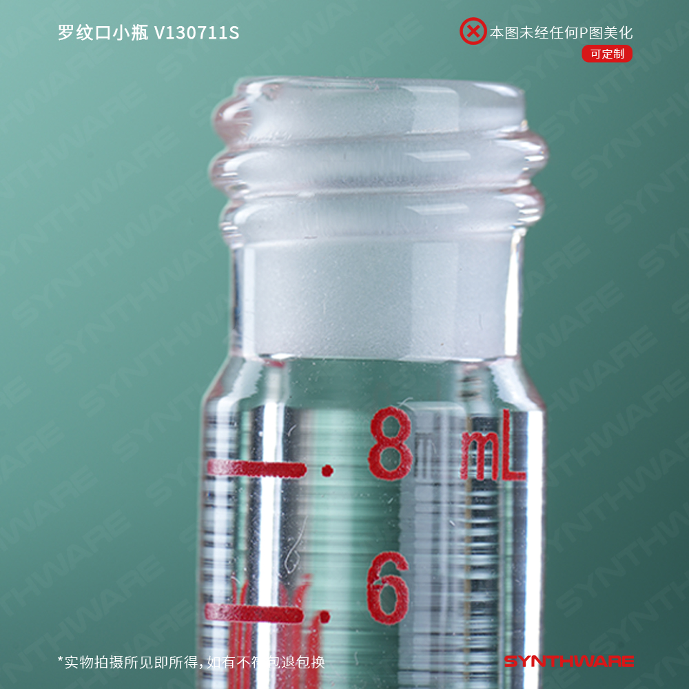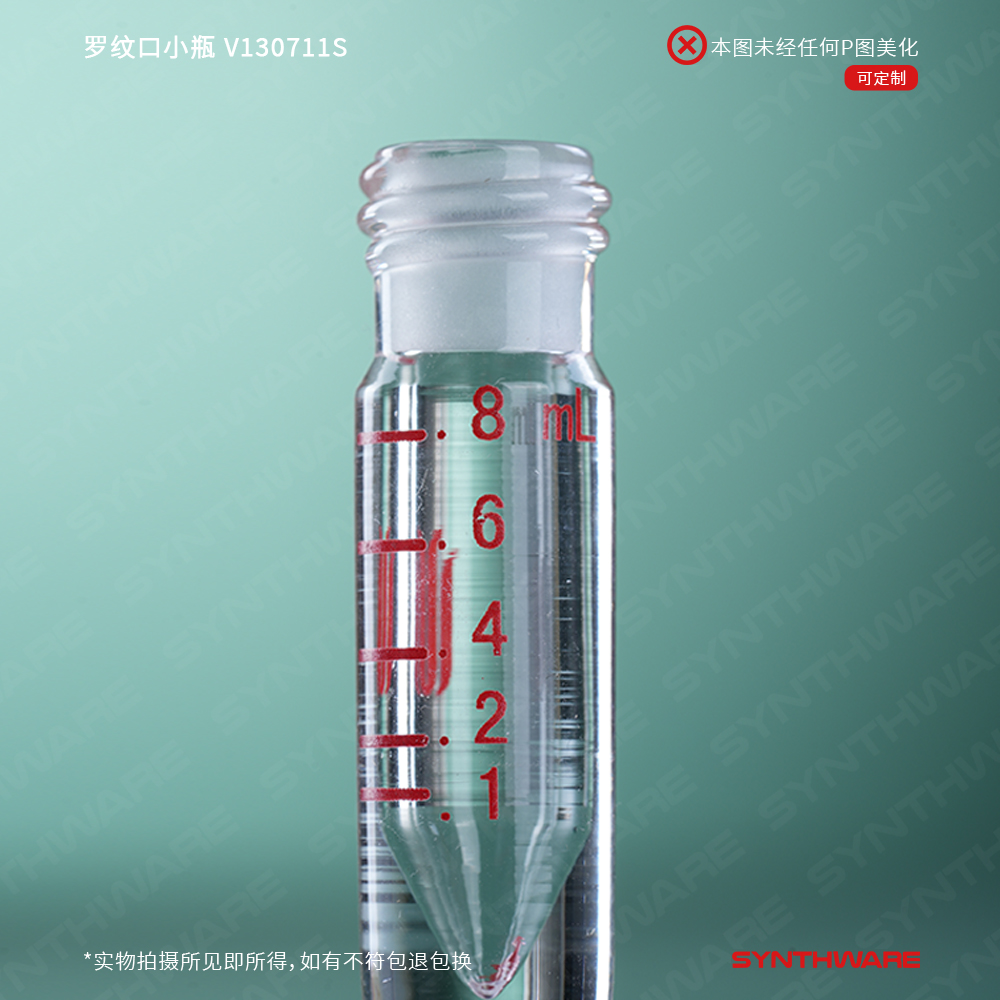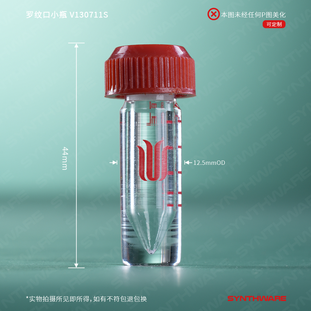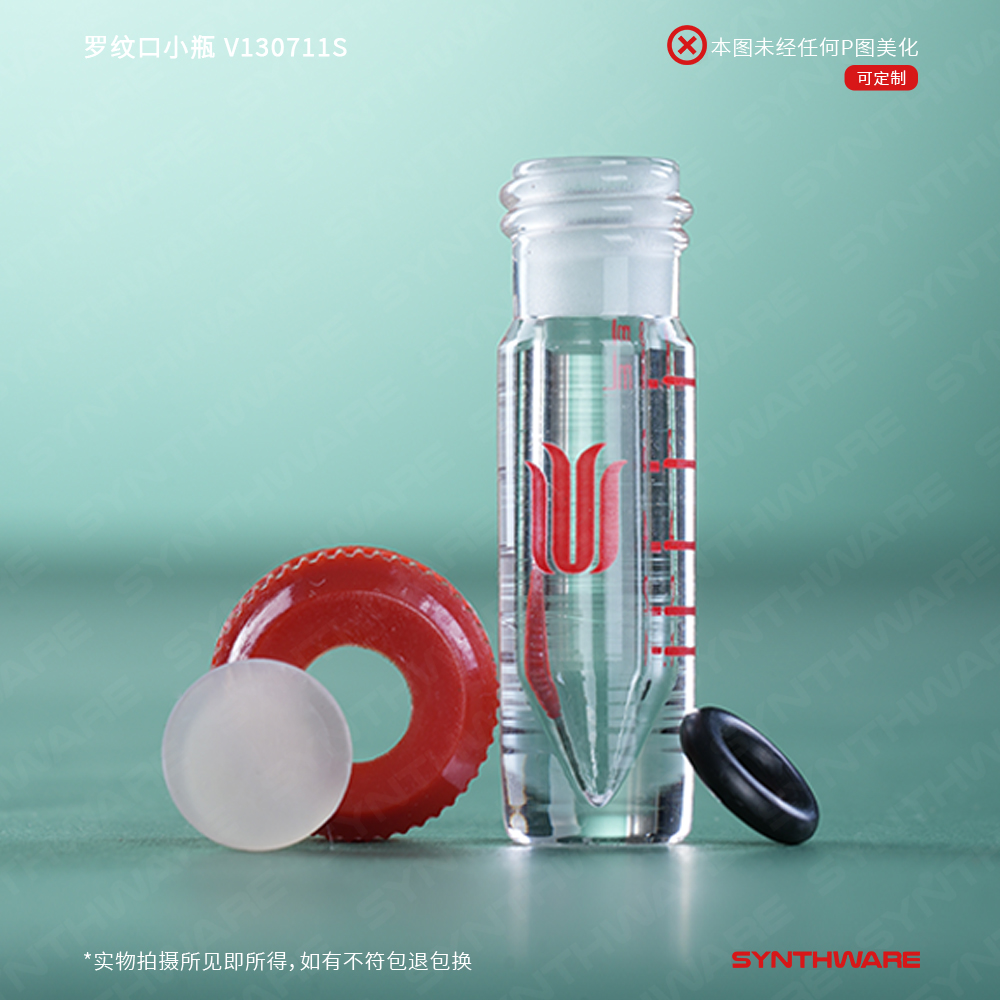罗纹口小瓶,内具锥形底部,厚壁;标配有无孔螺纹盖,具四氟垫片 V130711S