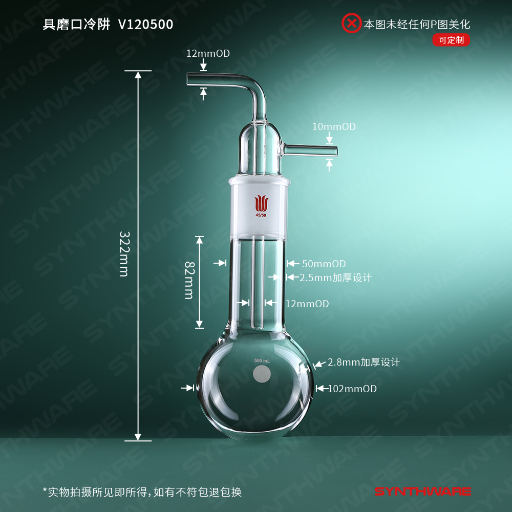 阱体为大容量设计,上下部分连接口为45/50磨口。中间导气管外径为12mm,右侧支管外径为10mm.
