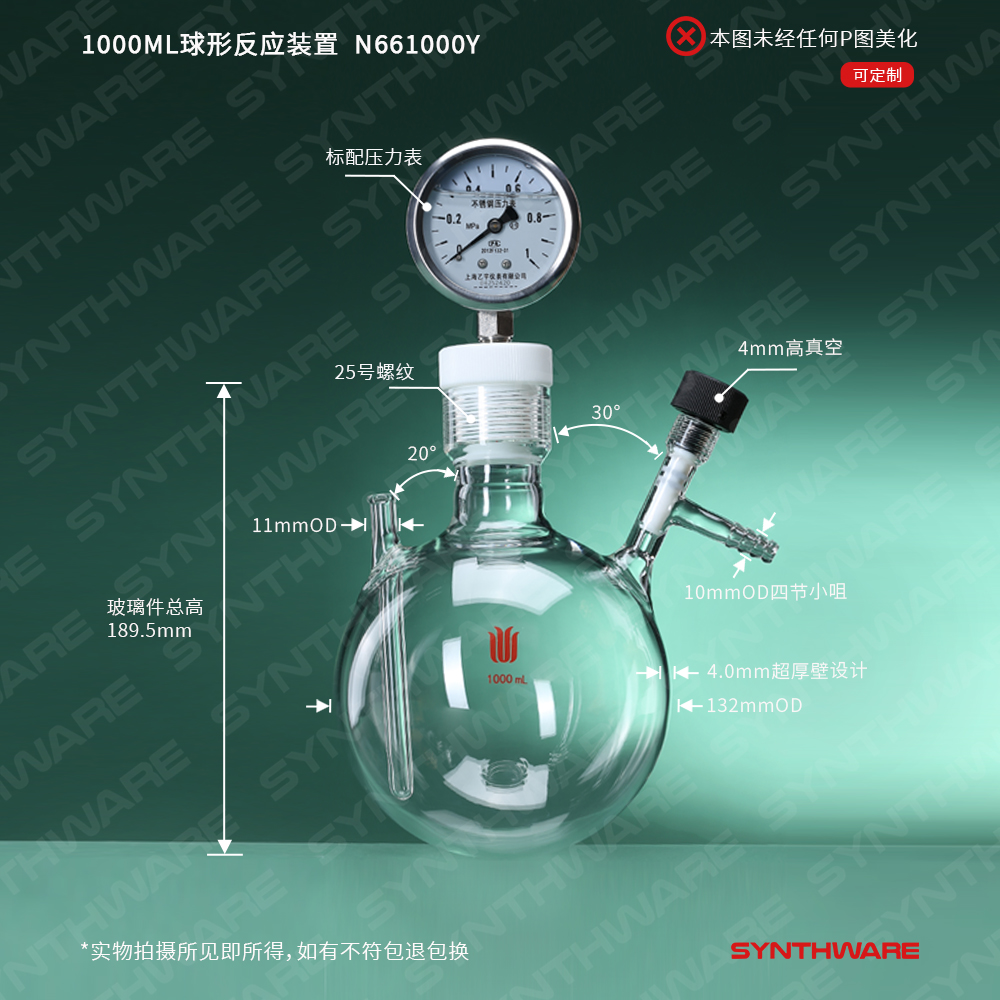 1000ML球形反应装置,左侧口为温度计套管(含0-1MPa压力表),瓶体最高耐压值 0.4Mpa。 N661000Y